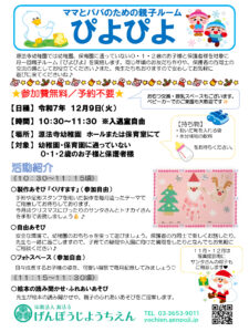 源法寺幼稚園では、園庭開放に加えて幼稚園・保育園に通っていない0・1・2歳のお子様と保護者様を対象に、ママとパパのための親子ルーム「ぴよぴよ」を開催しています。(参加費無料)