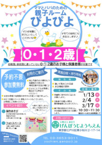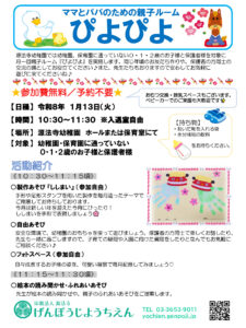 源法寺幼稚園では、園庭開放に加えて幼稚園・保育園に通っていない0・1・2歳のお子様と保護者様を対象に、ママとパパのための親子ルーム「ぴよぴよ」を開催しています。(参加費無料)